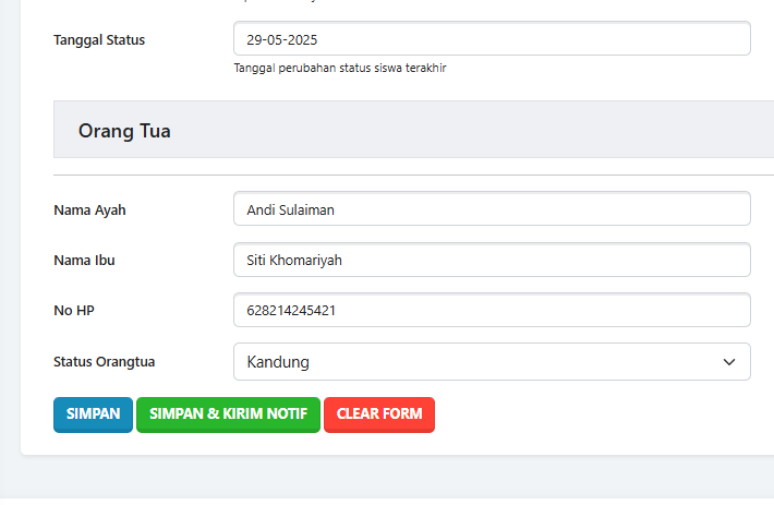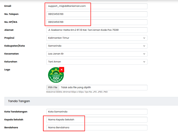 *) Diperlukan untuk notifikasi setiap ada pendaftar baru di SPMB dan pembayaran siswa melalui transfer.- Nama Kepala Sekolah